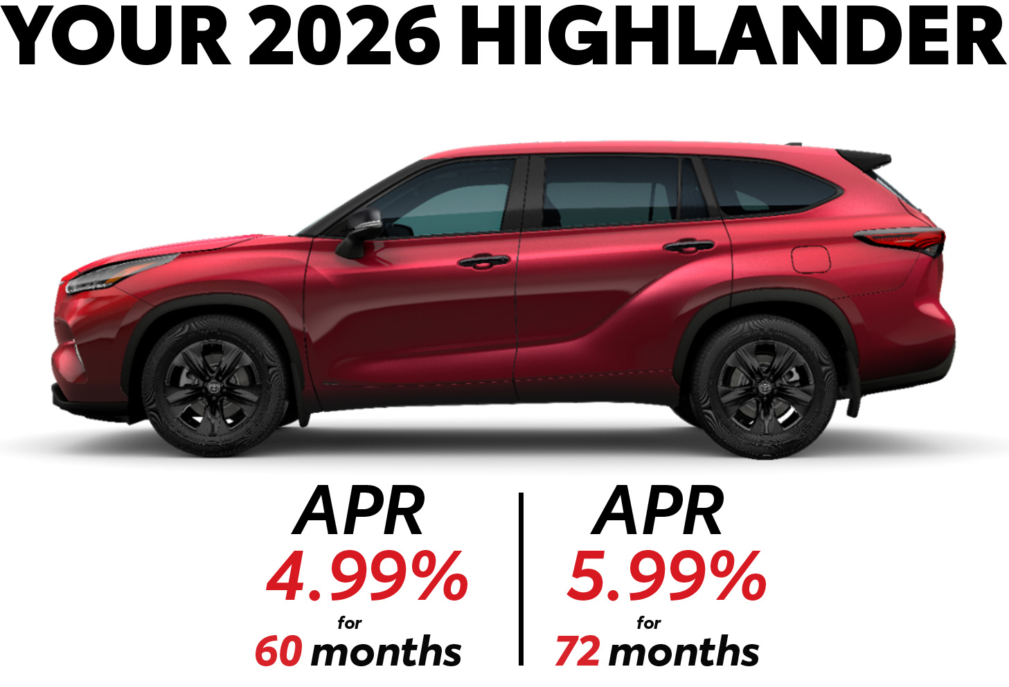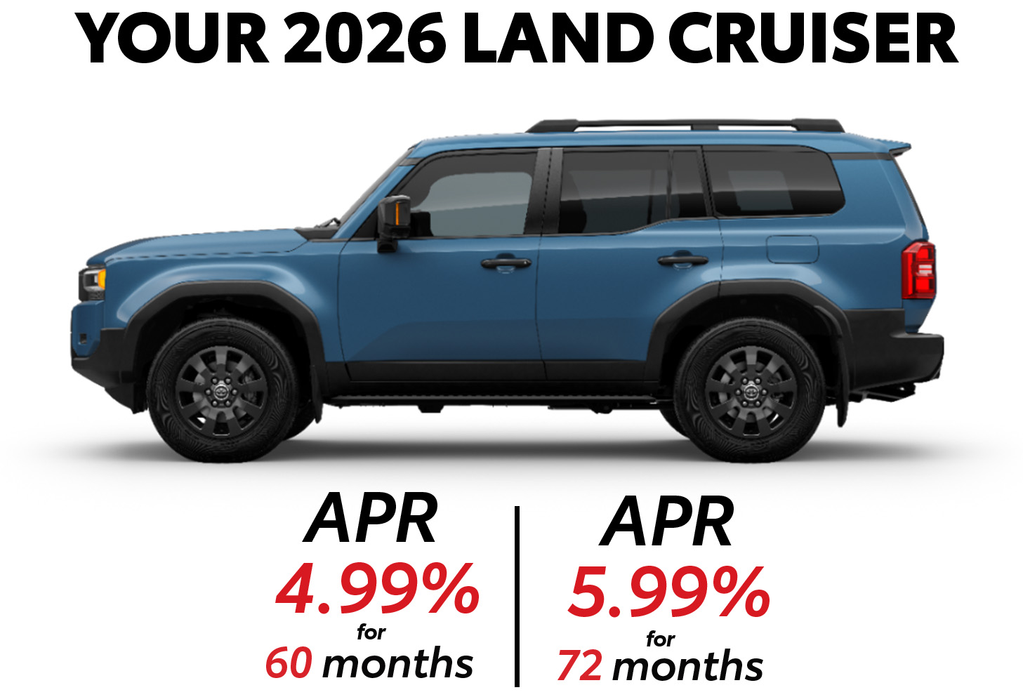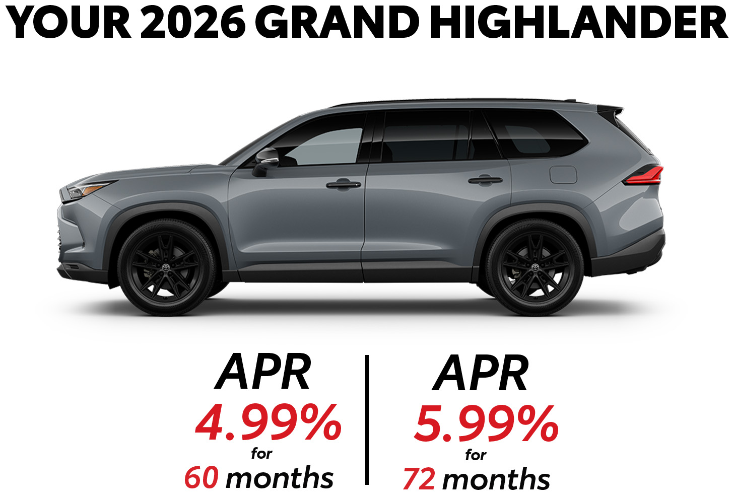 4.99% APR FINANCING UP TO 72 MONTHS AVAILABLE TO WELL QUALIFIED BUYERS THROUGH TOYOTA FINANCIAL SERVICES. 72 MONTHLY PAYMENTS OF $16.10 FOR EACH $1000 BORROWED. RESTRICTIONS APPLY. SEE DEALER FOR MAXIMUM AMOUNT WHICH CAN BE FINANCED AT ADVERTISED APR. NOT ALL BUYERS WILL QUALIFY. TAKE RETAIL DELIVERY FROM NEW DEALER STOCK BY 5/4/26; SUBJECT TO VEHICLE AVAILABILITY. DEALER FEES ARE EXTRA AND VARY BY DEALER. DEALER SETS FINAL PRICE. OFFER MAY NOT BE COMBINED WITH OTHER OFFERS UNLESS SPECIFIED OTHERWISE. VEHICLE SHOWN MAY BE PROTOTYPE AND/OR SHOWN WITH OPTIONS.