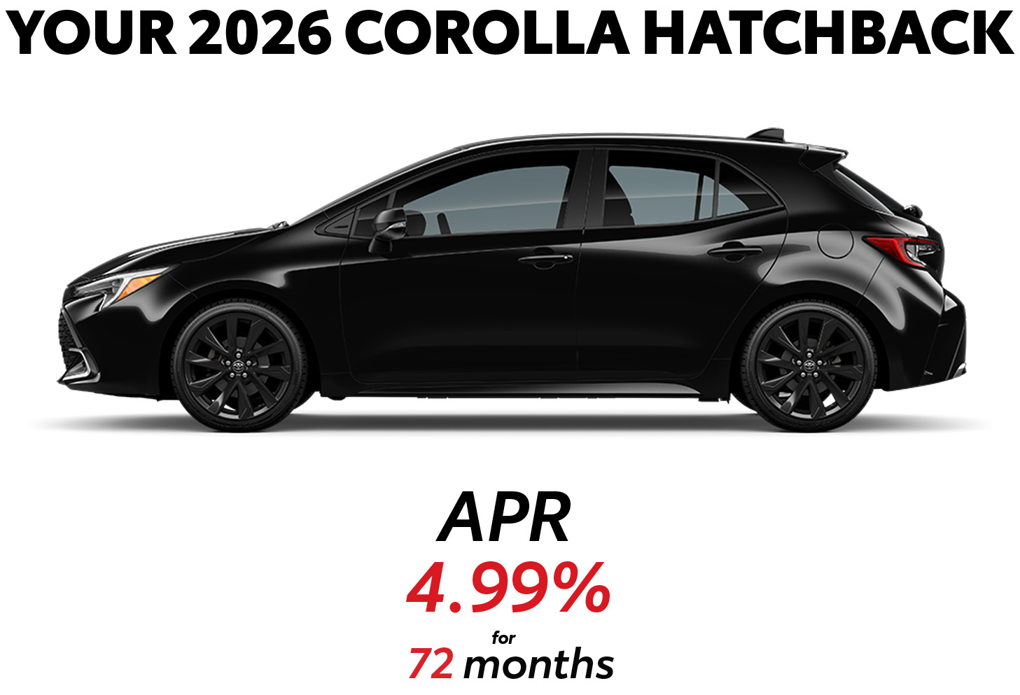 EXCLUDES CROSS MODELS. 4.99% APR FINANCING UP TO 72 MONTHS AVAILABLE TO WELL QUALIFIED BUYERS THROUGH TOYOTA FINANCIAL SERVICES. 72 MONTHLY PAYMENTS OF $16.10 FOR EACH $1000 BORROWED. RESTRICTIONS APPLY. SEE DEALER FOR MAXIMUM AMOUNT WHICH CAN BE FINANCED AT ADVERTISED APR. NOT ALL BUYERS WILL QUALIFY. TAKE RETAIL DELIVERY FROM NEW DEALER STOCK BY 12/1/25; SUBJECT TO VEHICLE AVAILABILITY. DEALER FEES ARE EXTRA AND VARY BY DEALER. DEALER SETS FINAL PRICE. OFFER MAY NOT BE COMBINED WITH OTHER OFFERS UNLESS SPECIFIED OTHERWISE. VEHICLE SHOWN MAY BE PROTOTYPE AND/OR SHOWN WITH OPTIONS.