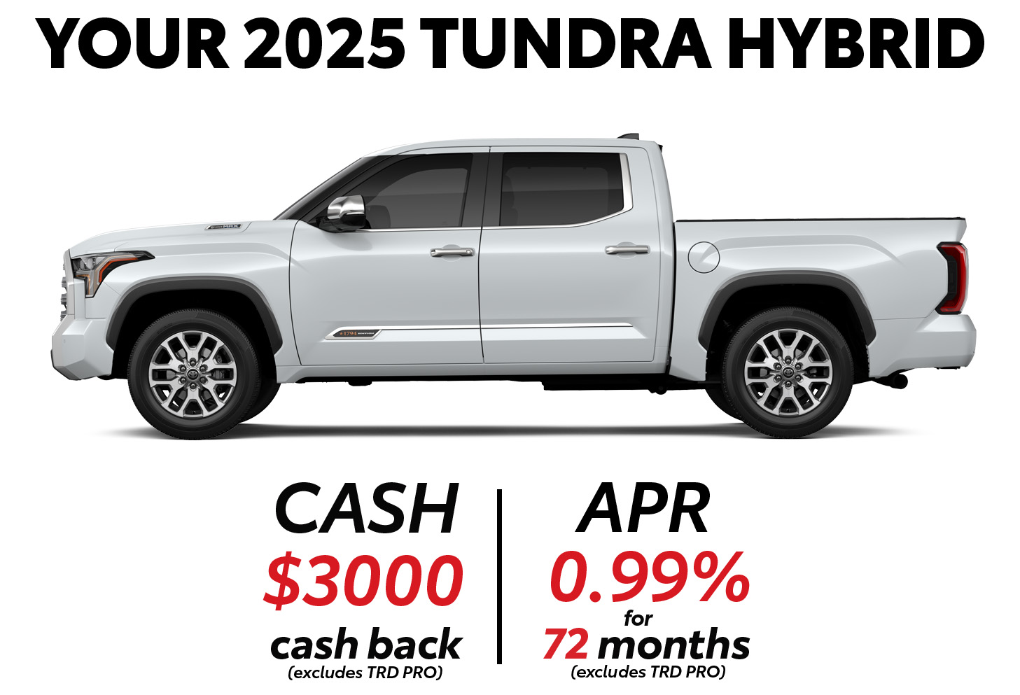 EXCLUDES TRD PRO. 0.99% APR FINANCING UP TO 72 MONTHS AVAILABLE TO WELL QUALIFIED BUYERS THROUGH TOYOTA FINANCIAL SERVICES. 72 MONTHLY PAYMENTS OF $14.31 FOR EACH $1000 BORROWED. RESTRICTIONS APPLY. SEE DEALER FOR MAXIMUM AMOUNT WHICH CAN BE FINANCED AT ADVERTISED APR. NOT ALL BUYERS WILL QUALIFY. TAKE RETAIL DELIVERY FROM NEW DEALER STOCK BY 12/1/25; SUBJECT TO VEHICLE AVAILABILITY. DEALER FEES ARE EXTRA AND VARY BY DEALER. DEALER SETS FINAL PRICE. OFFER MAY NOT BE COMBINED WITH OTHER OFFERS UNLESS SPECIFIED OTHERWISE. VEHICLE SHOWN MAY BE PROTOTYPE AND/OR SHOWN WITH OPTIONS.