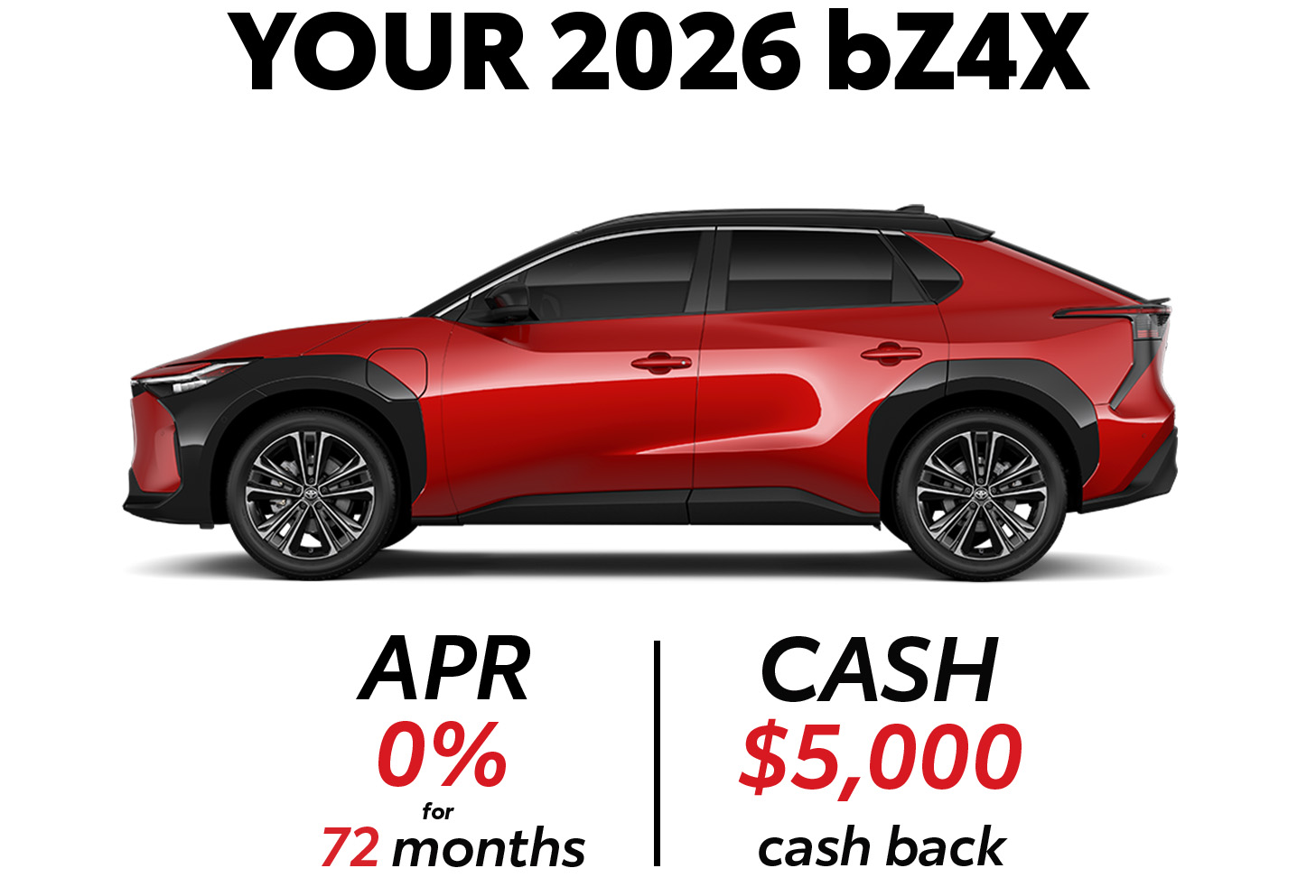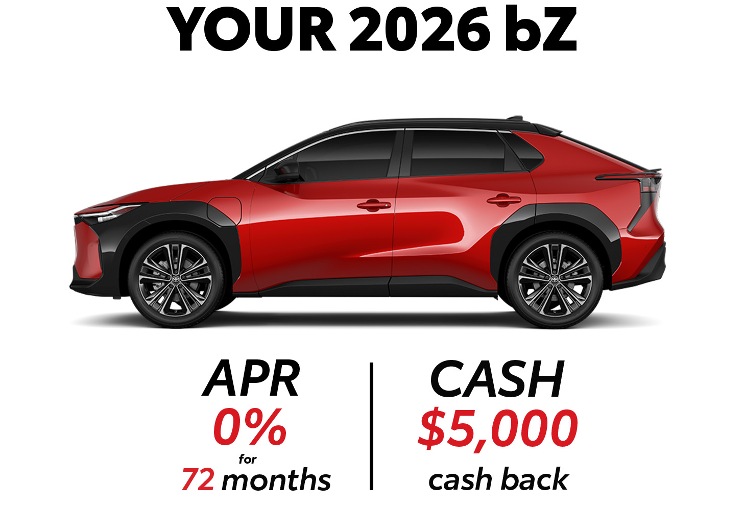 0% APR FINANCING UP TO 72 MONTHS AVAILABLE TO WELL QUALIFIED BUYERS THROUGH TOYOTA FINANCIAL SERVICES. 72 MONTHLY PAYMENTS OF $13.89 FOR EACH $1000 BORROWED. RESTRICTIONS APPLY. SEE DEALER FOR MAXIMUM AMOUNT WHICH CAN BE FINANCED AT ADVERTISED APR. NOT ALL BUYERS WILL QUALIFY. TAKE RETAIL DELIVERY FROM NEW DEALER STOCK BY 12/1/25; SUBJECT TO VEHICLE AVAILABILITY. DEALER FEES ARE EXTRA AND VARY BY DEALER. DEALER SETS FINAL PRICE. OFFER MAY NOT BE COMBINED WITH OTHER OFFERS UNLESS SPECIFIED OTHERWISE. VEHICLE SHOWN MAY BE PROTOTYPE AND/OR SHOWN WITH OPTIONS.